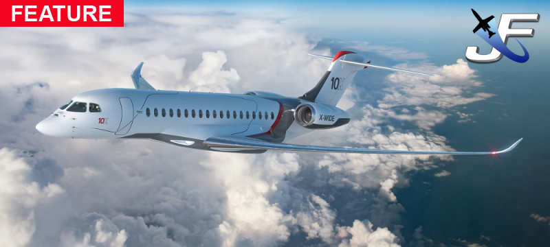 Falcon 10X Unveiled By Dassault Falcon Competition in the long-haul and large-cabin segment is heating up once again. Bombardier was first out of the blocks with the next generation of long-haul aircraft, the Global 7500. Gulfstream followed with the G700 which is currently in development. Now the French have stepped into the ring to contest the top of the competition. JF knew that Dassault Falcon was working on a new Falcon to come after the 6X but there was no idea what direction the French airframer was going to go in with the new model. The Falcon 10X is that new model and we have all the information you need to know about it. Featuring a range of 7,500 nautical miles, the Falcon 10X will fly nonstop from New York to Shanghai, Los Angeles to Sydney, Hong Kong to New York or Paris to Santiago. Top speed will be Mach 0.925 which pits it squarely in direct competition with the G700 and Global 7500.