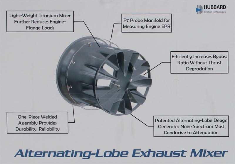 Hubbard Aviation Technologies QS3 Hushkit 1 QS3's nozzle has ten lobes, five shallow and five deep, alternating around its circumference to allow deep penetration of high-velocity jet exhaust, effectively mixing the hot exhaust with ambient air to lower the temperature and velocity – without thrust loss.