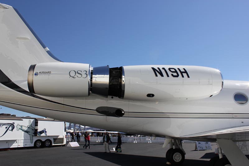 Hubbard Aviation Technologies QS3 Noise Suppressing Hushkit Hubbard Technologies displayed their noise suppressing "Hushkit" at the 2012 NBAA Static Display, located at Orlando Executive Airport. This aftermarket kit consists of an aft-mounted nacelle that reduces the noise signature of thrust exiting the main engines, in similar fashion to the silencer mounted to a gun barrel. The Hushkit works by encapsulating and diffusing sound waves at their strongest point; when thrust exits the engine. Additional sound dampening is achieved by inducing air from outside the main engine's nacelle and venting it into the thrust stream. There are three components that make up the QS3 Hushkit; a diffusing exhaust nozzle, an acoustically-lined aft-nacelle and a cascade-style thrust reverser all working in conjunction to absorb noise while maintaining engine performance. ***